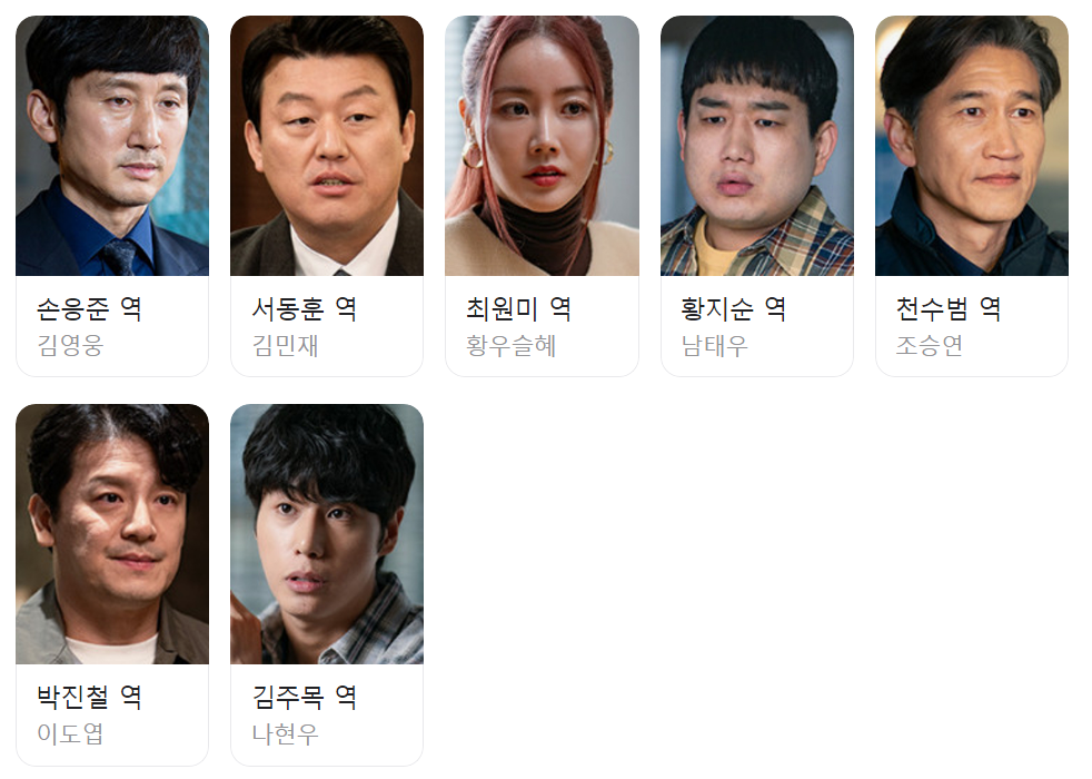 - 이외 출연자: 송영창 (지동만 역), 김영웅 (손응준 역), 김민재 (서동훈 역), 황우슬혜 (최원미), 남태우 (황지순), 조승연 (천수범 역), 이도엽 (박진철 역), 나현우 (김주목 역)
