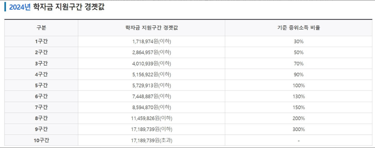 아래에 학자금 지원 구간을 확인하시어 해당 구간으로 신청을 하시기 바랍니다. 우선적 학자금 지원 대상자 선정을 위해 소득재산 조사를 시행하여 산정한 학생 가구의 소득 인정액을 재단의 학자금 지원 구간 구간표에 반영하여 결정한 구간값입니다.