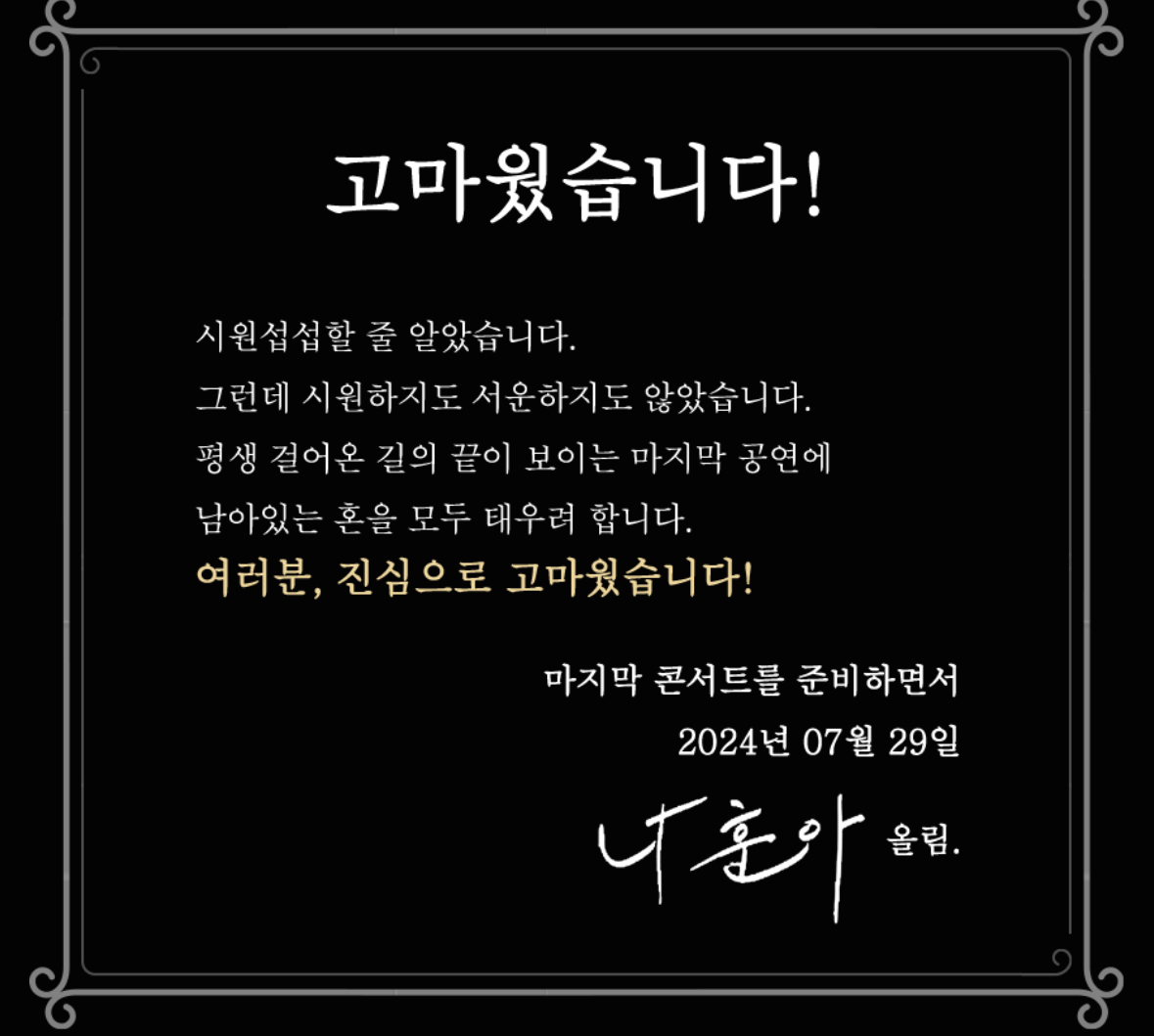 가요계의 큰 오빠, 형인 나훈아 콘서트가 마지막을 향해 달려가고 있습니다. 이번이 아니면 나훈아 콘서트를 절대 볼 수가 없는데요. 절대 놓치지 않고 전석 2분 만에 모두 매진되는 콘서트 일정, 성공하는 예매 방법까지 아래에서 확인하시고 나훈아의 마지막 콘서트를 절대 놓치지 마시기 바랍니다.