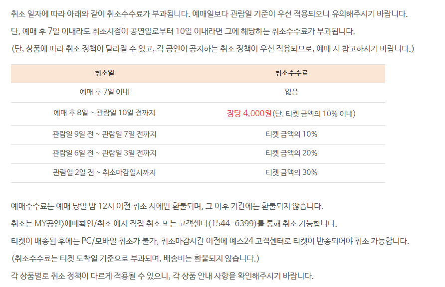 만약, 아쉽게도 티켓을 취소하는 경우가 있으실 수도 있으실 겁니다. 아래에 취소 정보 보시고 예매일, 관람일 감안하셔서 수수료 없이 취소 처리하시기 바랍니다.
