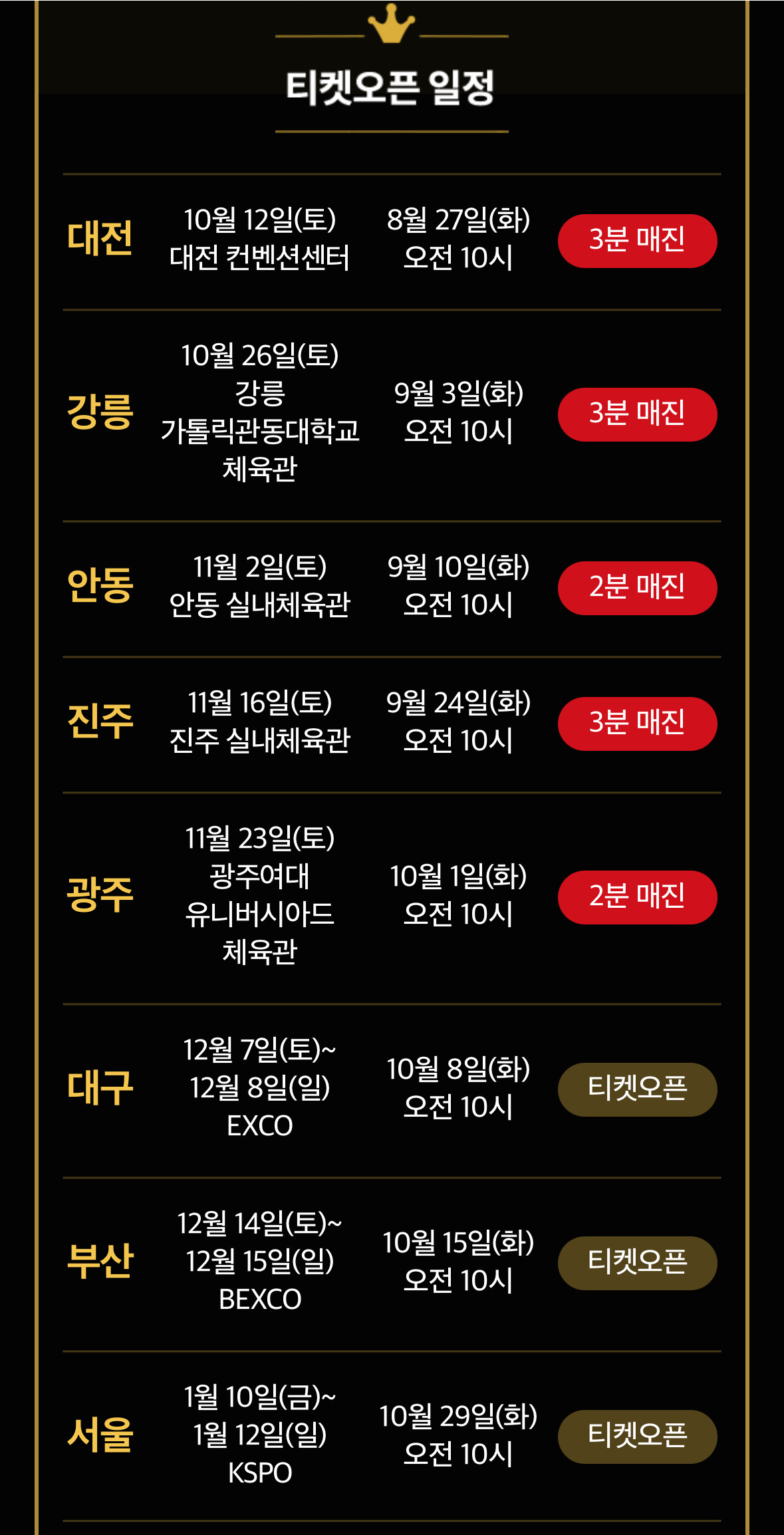 | 대구 콘서트 | 2024.12.07(토)~12.08(일) | 대구 엑스포 | 2024. 10. 8(화) 오전 10시~ |