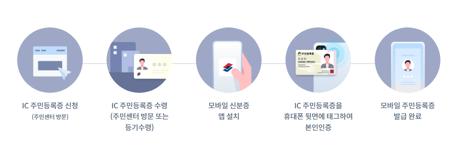 - 신청 절차: IC 주민등록증 소지시 모바일 신분증 APP 설치 > IC 주민등록증 휴대폰 뒷면에 태그 하여 본인 인증> 모바일 주민등록증 발급 완료