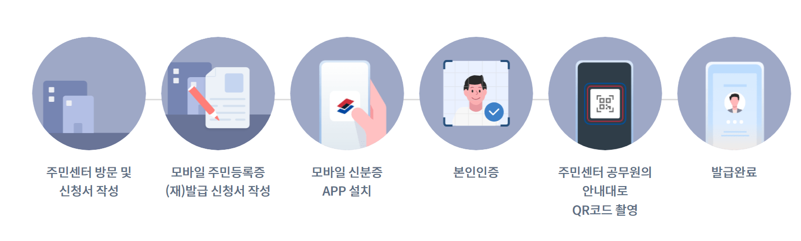 - 신청 절차: 주민센터 방문하여 신청서 작성 > 모바일 주민등록증 발급 신청서 작성 > 모바일 신분증 APP 설치 > 본인 인증 > 주민센터 공무원의 안내대로 QR 코드 촬영 > 발급 완료