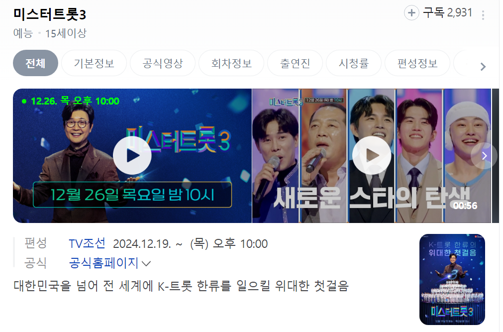기다리고 기다리던 미스터트롯 3가 시작됐습니다. 12월 19일 목요일 밤 10시를 시작으로 새로운 트롯 신드롬을 불러일으킬 새로운 가수들이 대거 발굴될 것으로 기대가 많이 됩니다.
