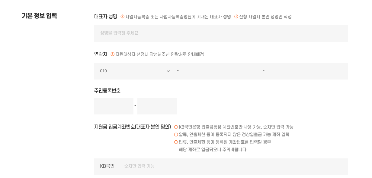홈페이지 내 기본 정보 (이름, 연락처, 주민등록번호, 계좌번호) 입력 > 사업장 정보 (상호명, 사업자 등록번호) 입력 > 증빙서류 첨부 (사업자 등록증, 신분증 사본, KB국민은행 통장 사본) > 제출하면 완료