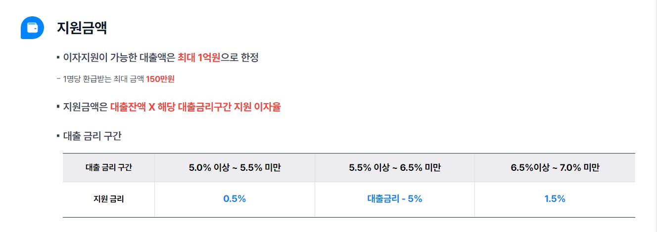 - 5.5% 이상 6.5% 미만 인 경우: 대출받은 금리 - 5% 이자 환급 지원 가능
