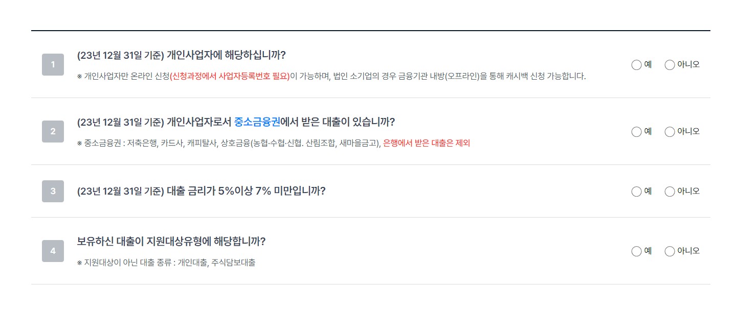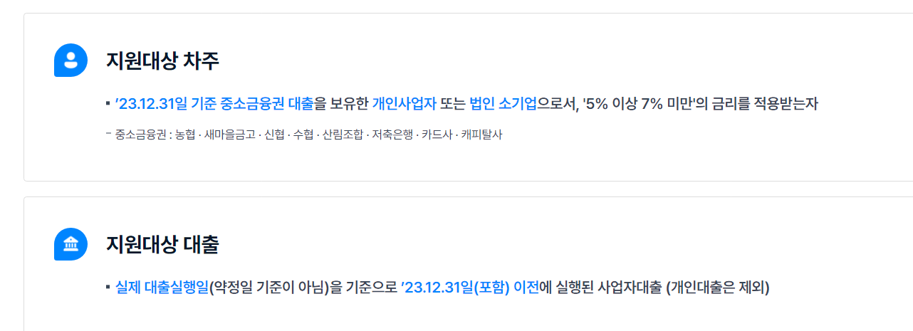 - 23년 12월 31일 기준으로 중소금융권 대출을 가지고 있는 개인 사업자 또는 법인 소기업으로. 5% 이상 7% 미만의 금리를 적용하여 이자를 내고 있는 경우에 해당합니다