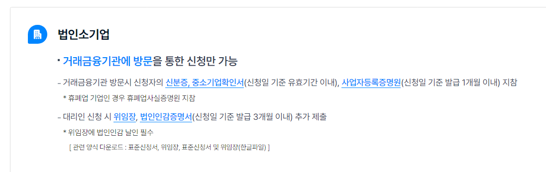 - 법인 소기업: 거래 금융기관에 방문하여 신청합니다. 필요 서류로는 본인 신분증, 중소기업 확인서 (신청일 기준 유효기간 이내), 사업자 등록증명원 (신청일 기준 발급 1개월 이내)가 필요하니 지참하여 방문해야 합니다.