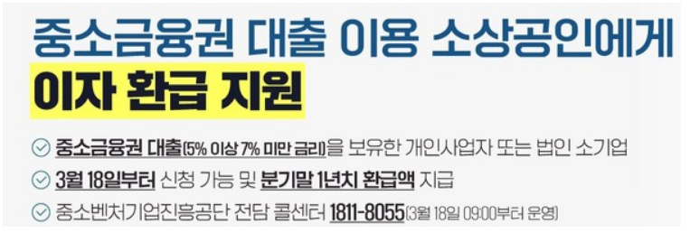 소상공인 이자 환급 제도는 상호금융, 저축은행, 여신전문금융회사 등 중소 금융 기관에서 대출을 받은 소상공인들을 대상으로 이자 부담을 덜어드리기 위해 지원하는 제도입니다.