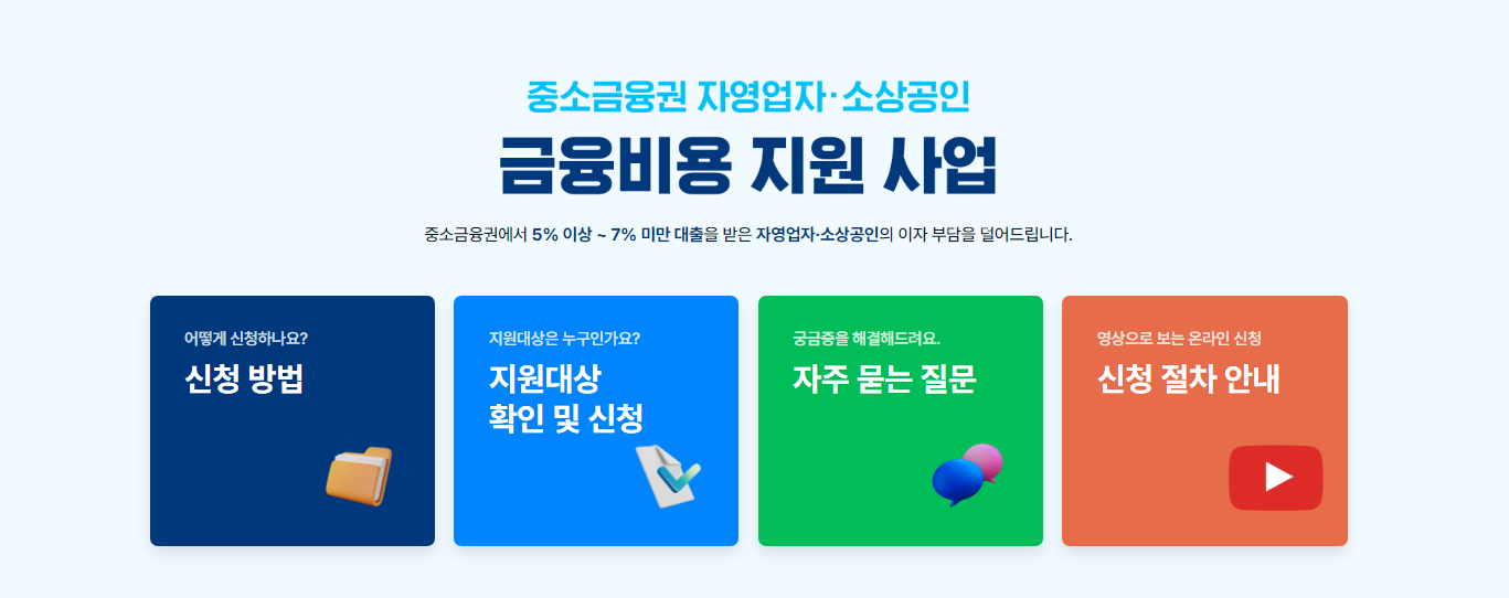 - 온라인 신청 방법: 중소금융권 금융비용 지원 신청조회 서비스에 접속하여 신청합니다.