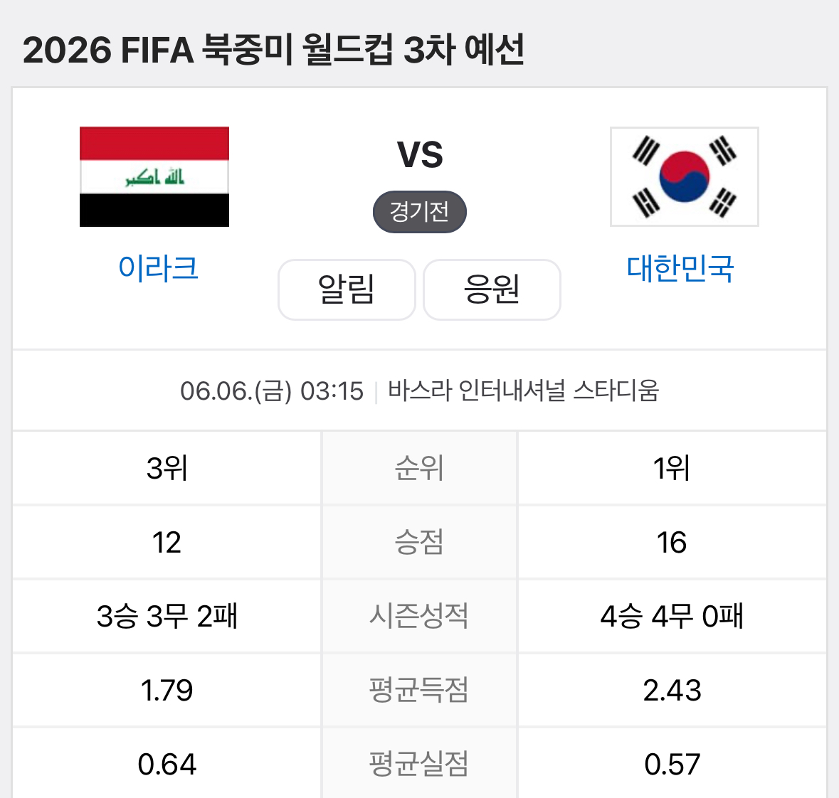이번 대한민국 vs 이라크 전 정보는 아래와 같습니다.