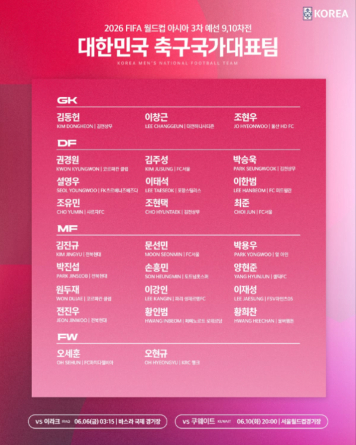 - 미드필더: 손흥민, 김진규, 황희찬, 박용우, 이강인, 이재성, 박진섭, 전진우, 원두재, 황인범, 문선민, 양현준