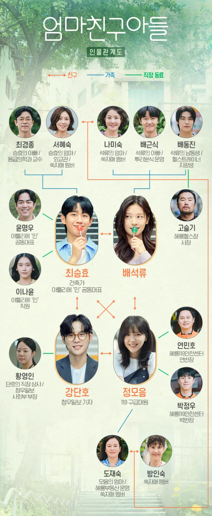 이 드라마의 인물관계도는 배석류, 최승효를 주로 하여 연결이 됩니다. 어렸을 때부터 알고 지낸 엄마친구아들과 엄친딸로 서로의 인생에 큰 영향을 끼친 친구들입니다.