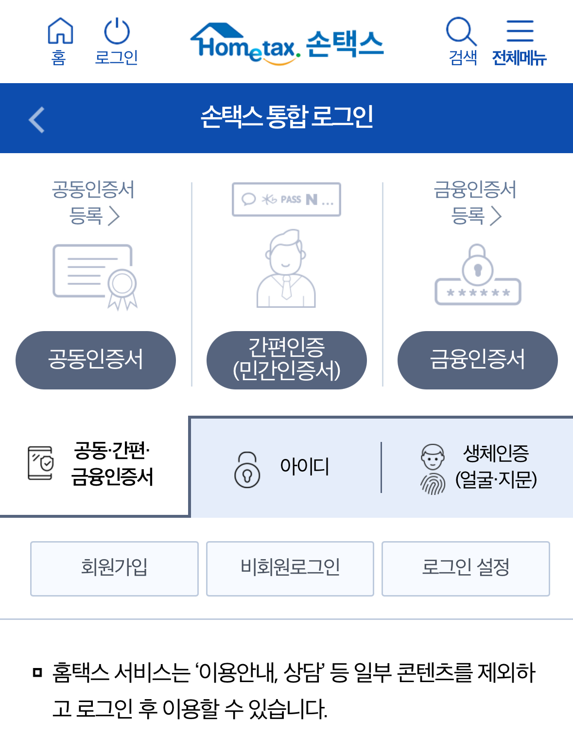 - 위 버튼을 통해 홈택스 접속: 국세청 홈택스 홈페이지에 접속합니다.