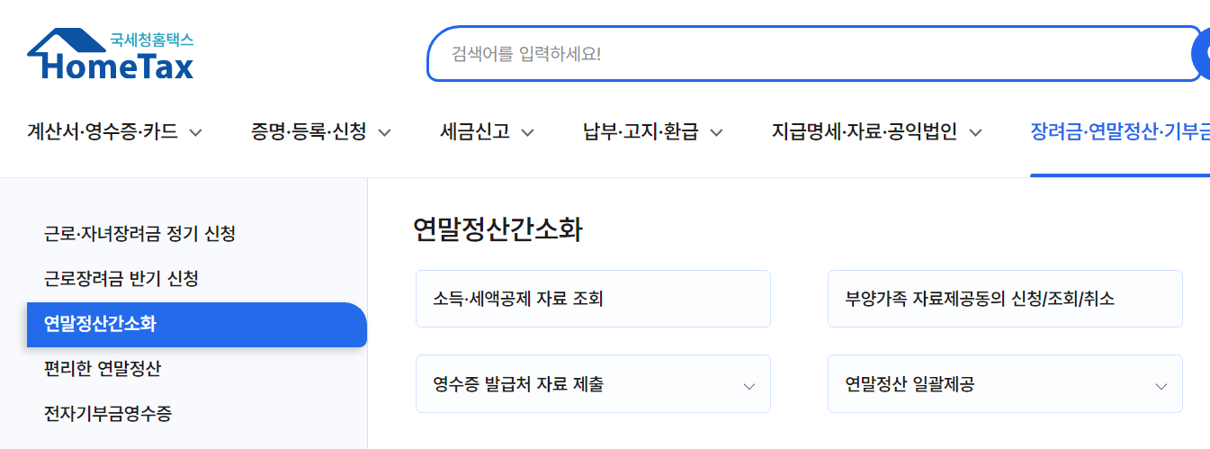 - 연말정산 간소화 서비스 클릭: 홈택스 메인 페이지에서 '연말정산 간소화' 서비스를 클릭하고 소득 공제 항목을 모두 확인이 가능하며, 세액 공제가 가능한 부분도 확인이 가능합니다.