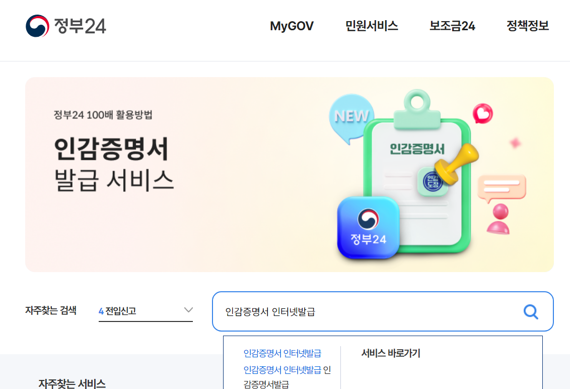1) 정부 24 홈페이지에 접속하여 검색창에 인감증명서 인터넷발급을 검색합니다.