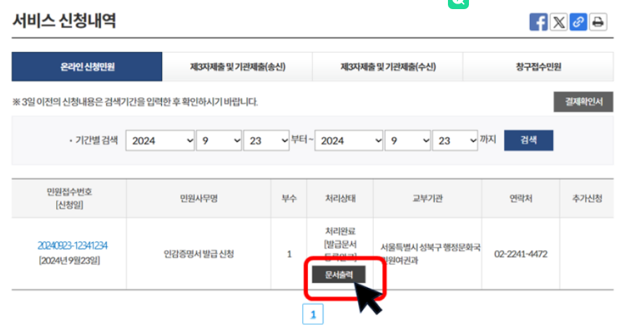 그리고 문서출력을 눌러 출력하시면 됩니다.