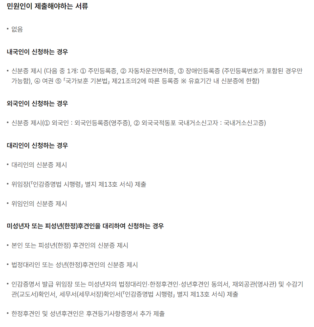 - 미성년자 및 피성년(한정) 후견인 대리 신청: 본인 또는 피성년 후견인의 신분증, 법정대리인 또는 성년 후견인의 신분증, 인감증명서 발급 위임장, 동의서