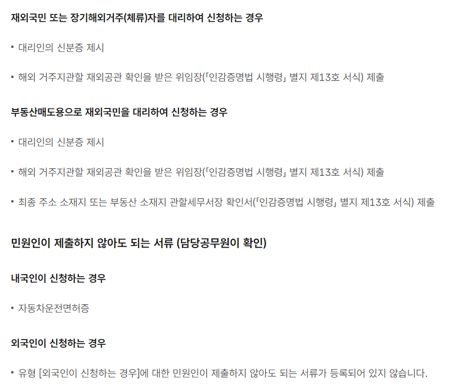 - 재외국민 및 장기 해외 거주자 대리 신청: 대리인의 신분증, 재외공관 확인을 받은 위임장