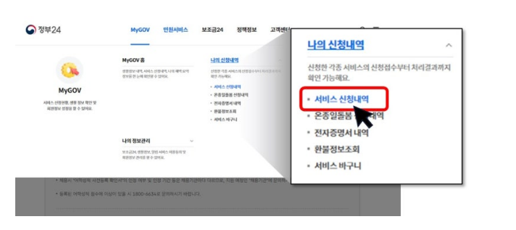 8) 인감증명서 출력를 하시려면 정부 24 메인 화면에서 ‘MyGOV > 나의 신청내역 > 서비스 신청내역'에 들어갑니다.