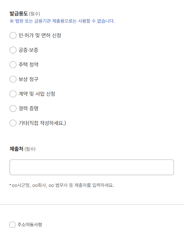 6) 발급용도, 제출하는 곳 등을 입력합니다.