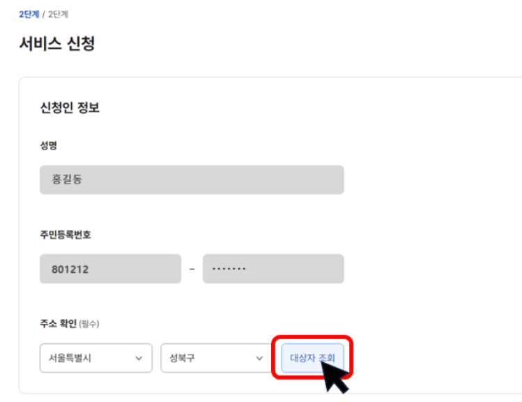4) 신청인 정보로 넘어가서 본인 이름과 주민등록번호를 확인하고, 주민등록 상 주소를 선택하신 후 대상자를 조회합니다.