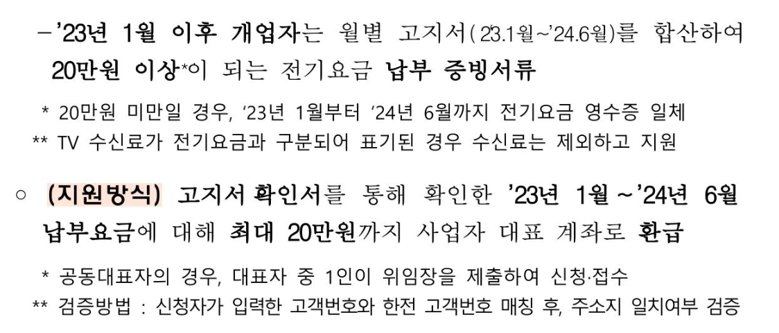 관리비 등에 전기료를 포함해서 납부하는 경우 등 한국전력과 직접 계약하지 않은 비계약 사용자는 월 1만 2천 원 이상 납부한 영수증 하나만 제출하면 전기 요금 지원금을 사장님 계좌로 환급받을 수 있습니다.