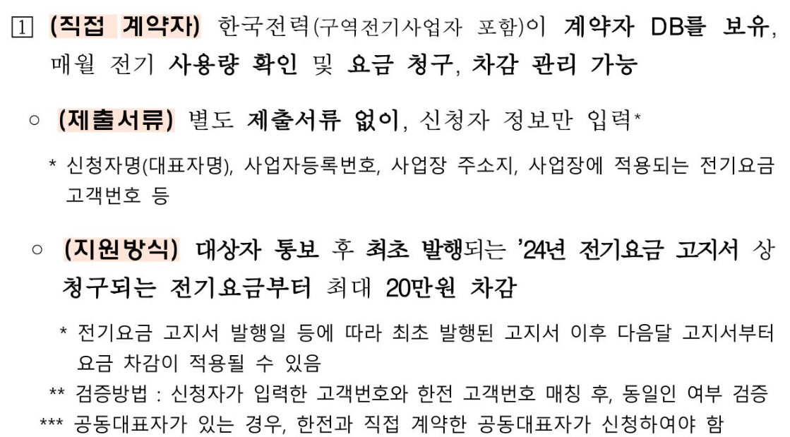 | 직접계약자 | 한국 전력 또는 구역 전기사업자와 직접 전기 사용 계약을 체결한 소상공인 |