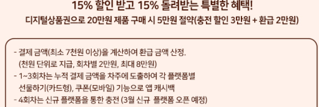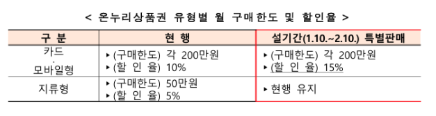 - 카드/모바일형: 구매한도는 각 200만원이며 할인율은 기존보다 훨씬 더 커진 15%로 상향되었습니다.