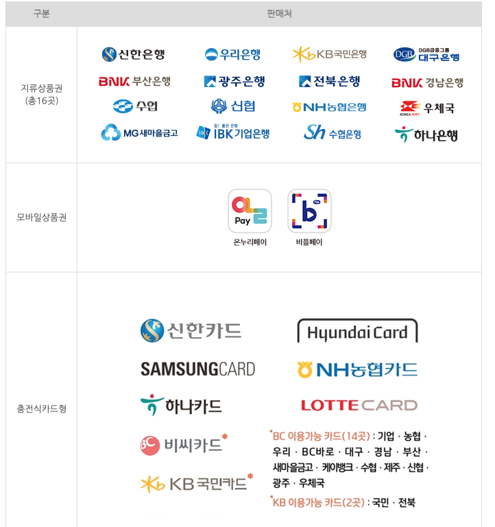 | 지류 상품권 | 주요 은행에서 구매 가능 (농협, 우리은행, 신한은행, 국민은행, 기업은행 등) |