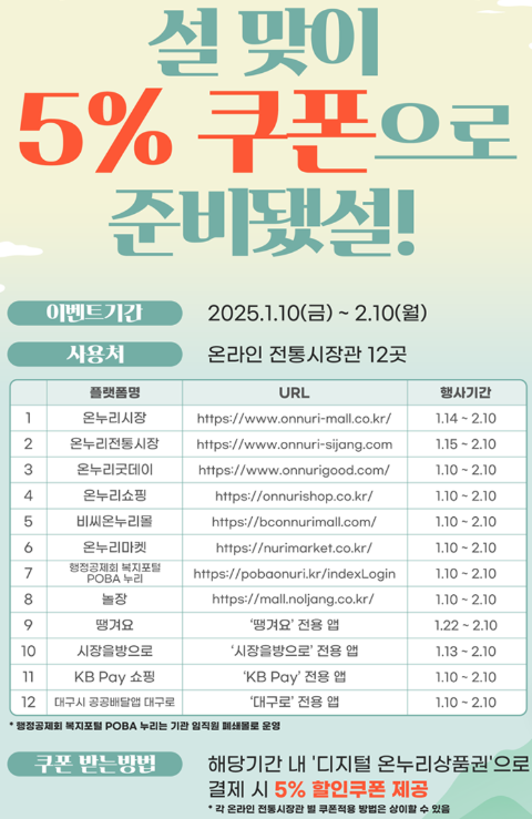 온누리 상품권을 이용하면 추가로 5% 할인 쿠폰을 받을 수 있는데요. 12곳의 온라인 전통시장관 특별 할인전에서 디지털상품권으로 상품을 구매하면 할인쿠폰 5% 를 바로 적용받을 수 있습니다.