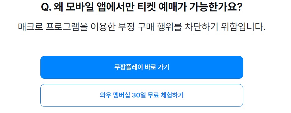 예매는 반드시 쿠팡플레이 앱에서만 가능합니다. 매크로 등의 부정 예매를 근절하기 위해 앱에서만 예매가 가능하오니 미리 쿠팡플레이 앱을 다운로드하여 놓으시고 회원 가입도 해놓으시는 것이 유리합니다.