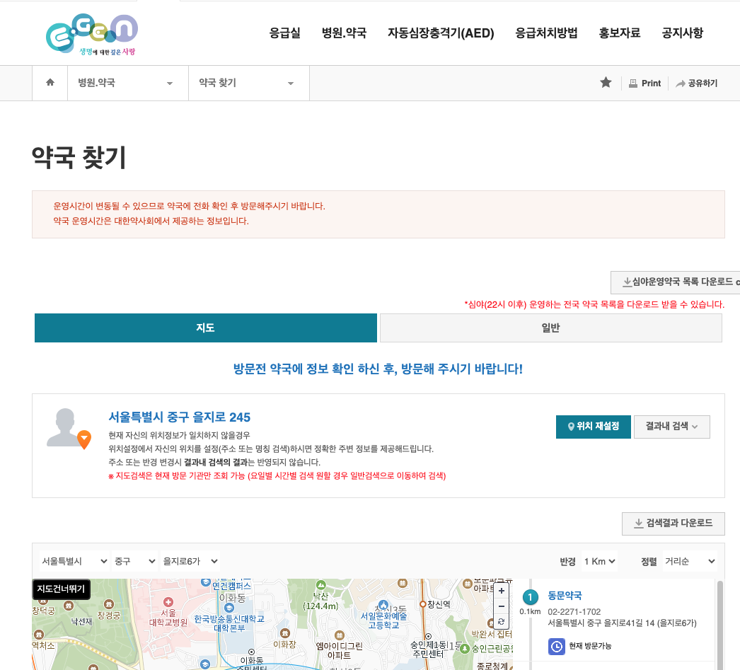 해당 사이트에서는 휴일에 진료하는 병원과 약국도 찾을 수 있고, 응급실 상황과 자동심장 충격기의 위치, 지역별 민간 구급차도 검색할 수 있으며, 응급상황 시에 대처 방법과 처치 방법도 나와있으니 필요하시면 반드시 확인하시기 바랍니다.