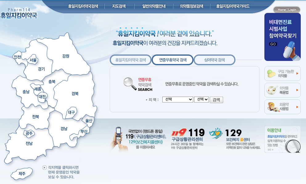 휴일이나 공휴일에 아프신가요? 이럴 때 정말 난감한데요. 휴일이나 야간에 문을 여는 병원과 약국을 찾는 게 참 어렵기도 합니다.