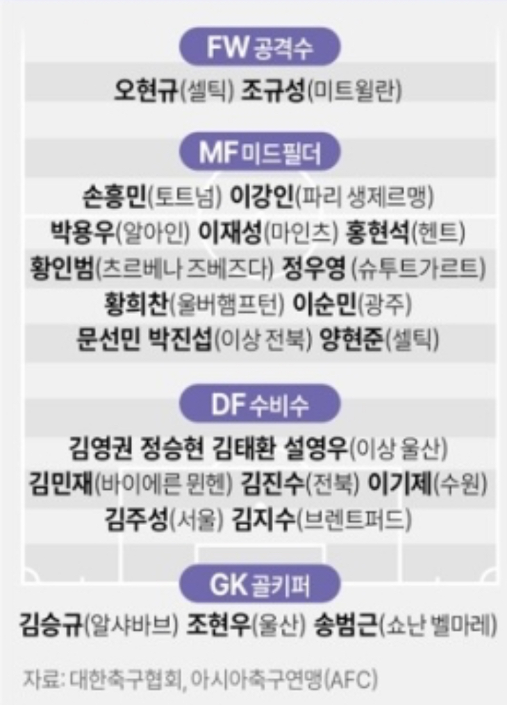 GK: 김승규(알샤밥), 조현우(울산 HD), 송범근 (쇼난벨마레)