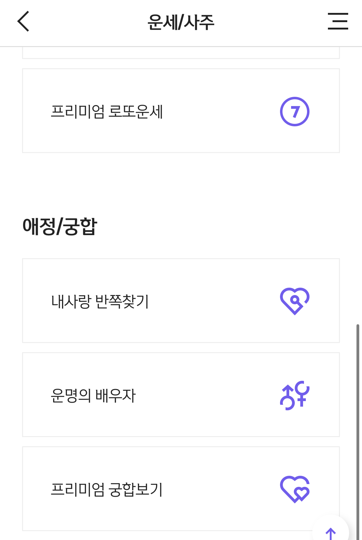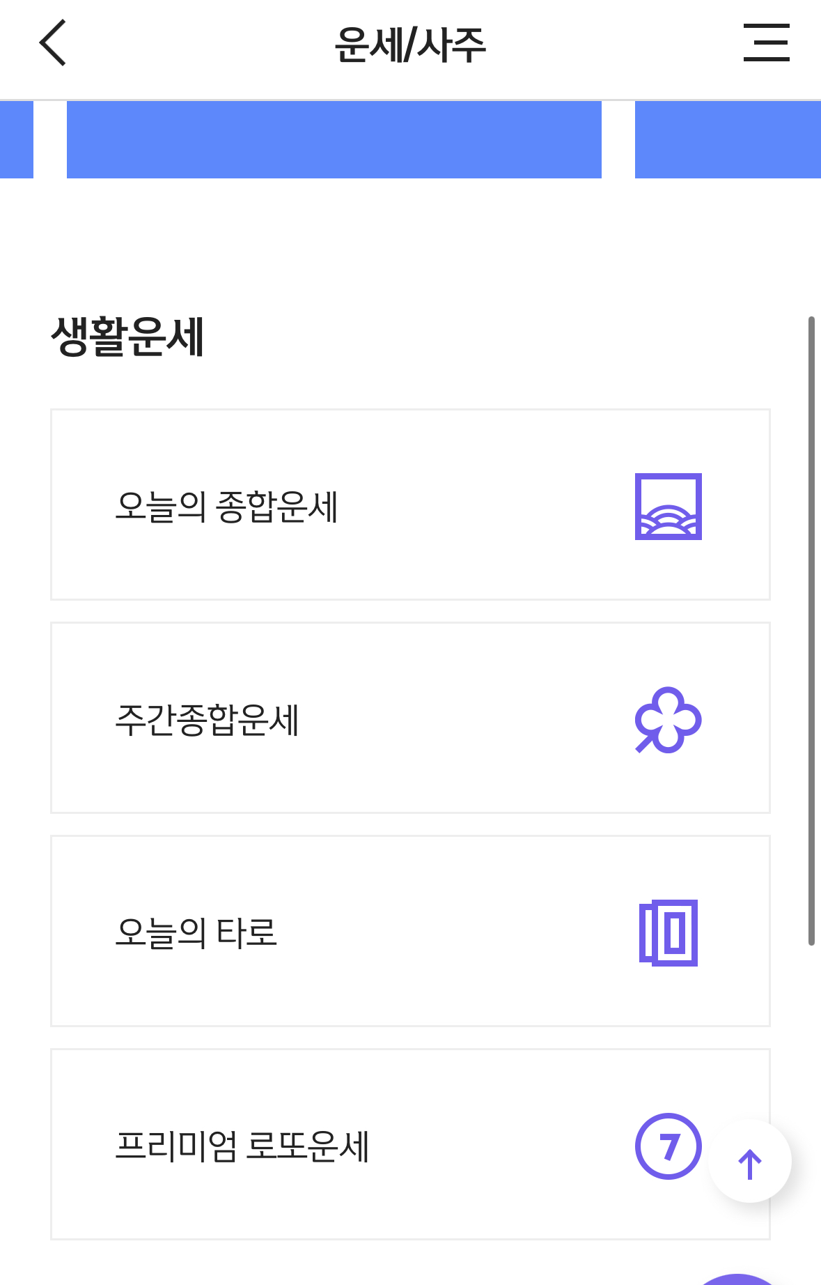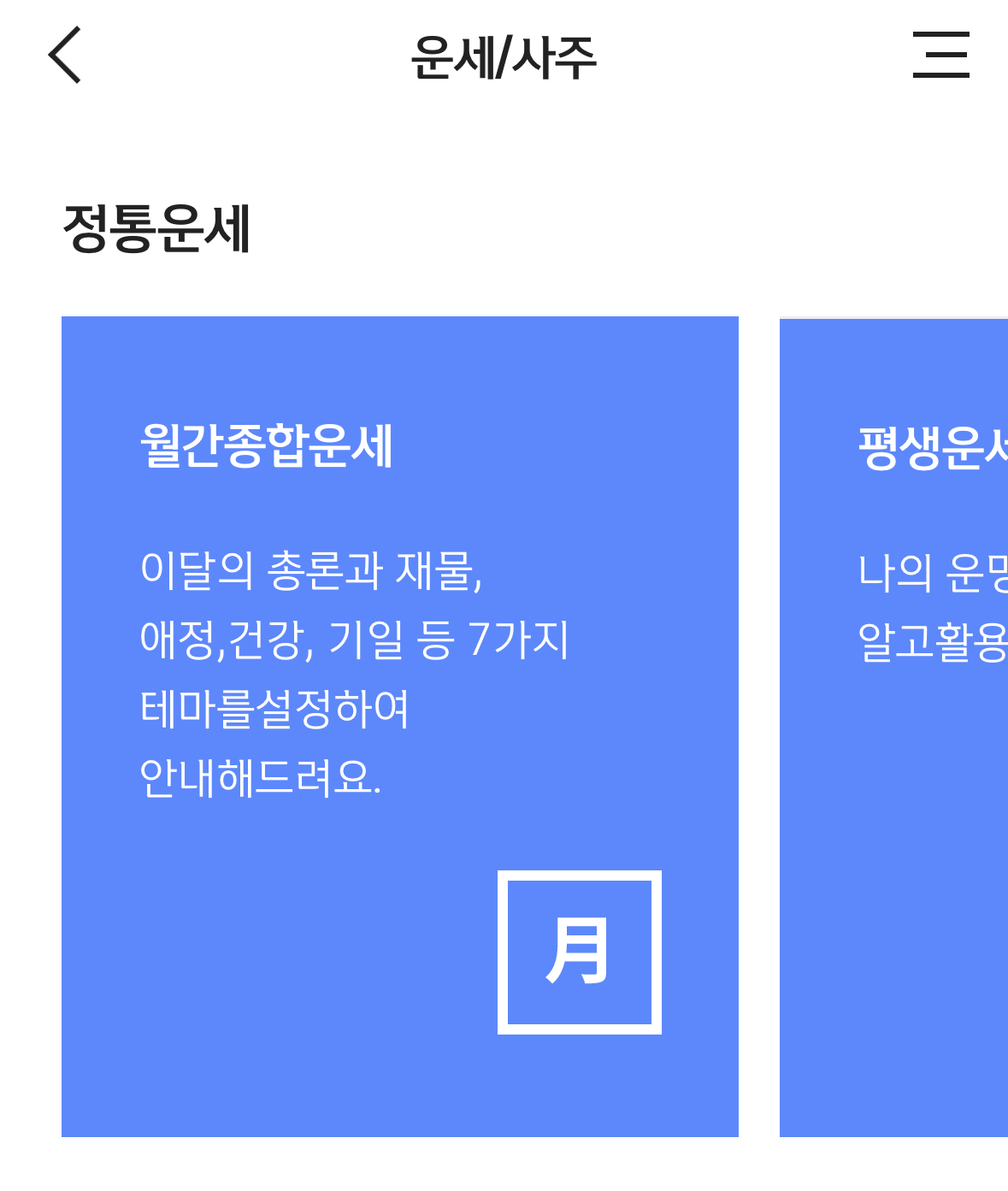 그리고 생활 운세인 오늘의 운세, 주별 운세, 타로, 프리미엄 로또 운세와 애정 궁합도 볼 수 있어서 다양한 운세를 한 번에 볼 수 있는 것이