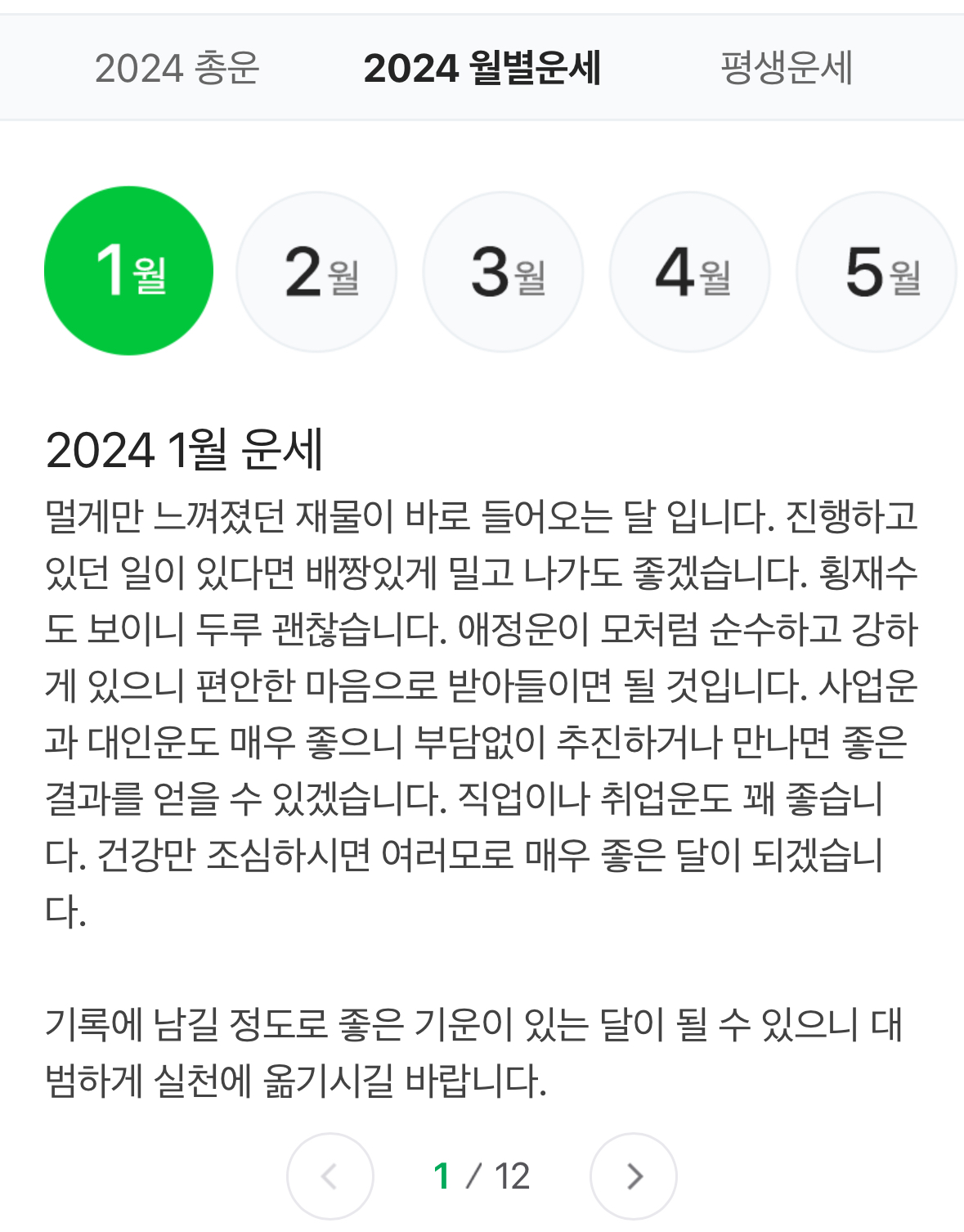 제공서비스로는 2024년 총운, 월별 운세, 평생 운세, 별자리 운세, 띠별 운세를 모두 볼 수 있습니다.