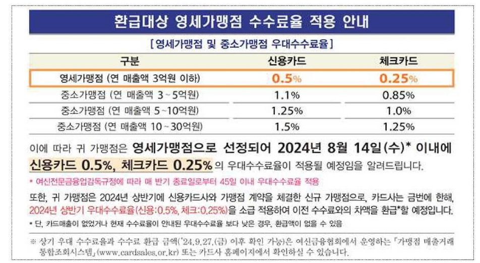 - 2024년 상반기 중 신규로 신용카드 가맹점을 개업하고, 일반 가맹점 수수료율을 적용을 받다가 이번에 안내문을 통해 영세/중소카드 가맹점에 해당하는 것으로 확인된 경우