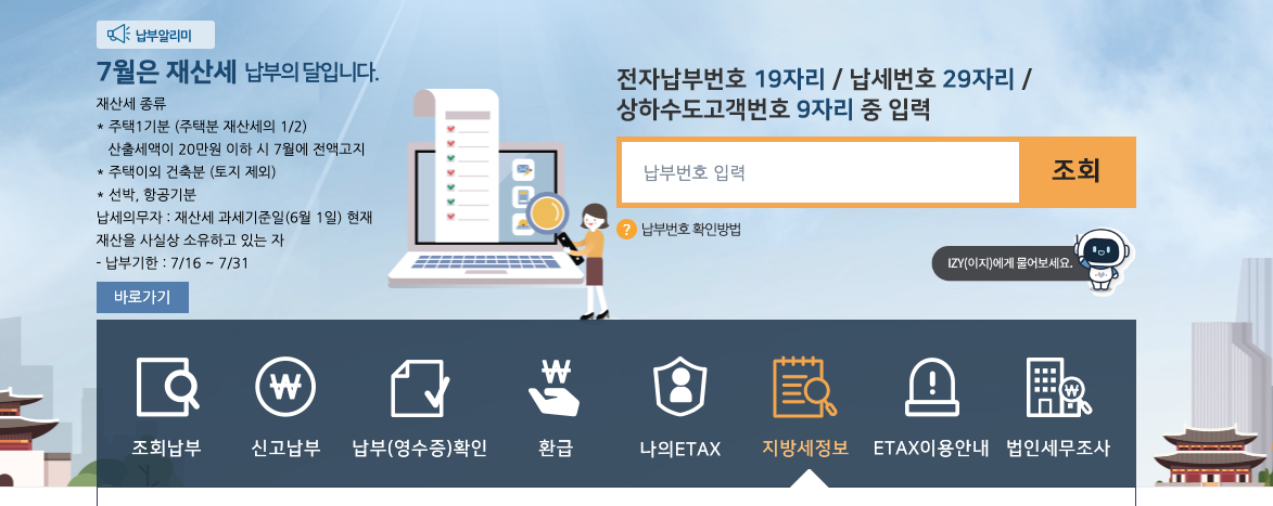 재산세는 위택스, 이택스 홈페이지 및 모바일앱을 통해서 간편하게 납부가 가능합니다.
