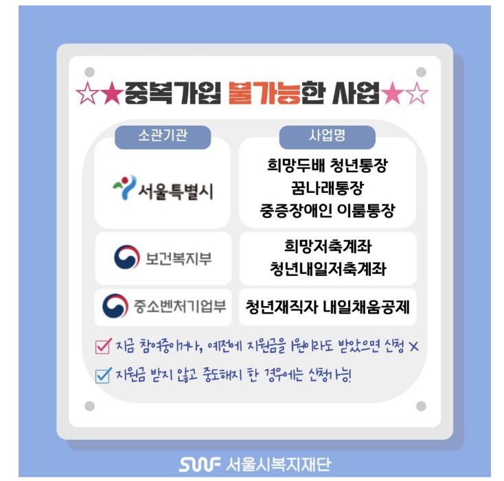 - 2024년 서울 시 청년 수당 또는 청년 월세 지원 사업 참여 중인 경우 (4월 말까지 중도해지 나 완료한 경우는 가능)