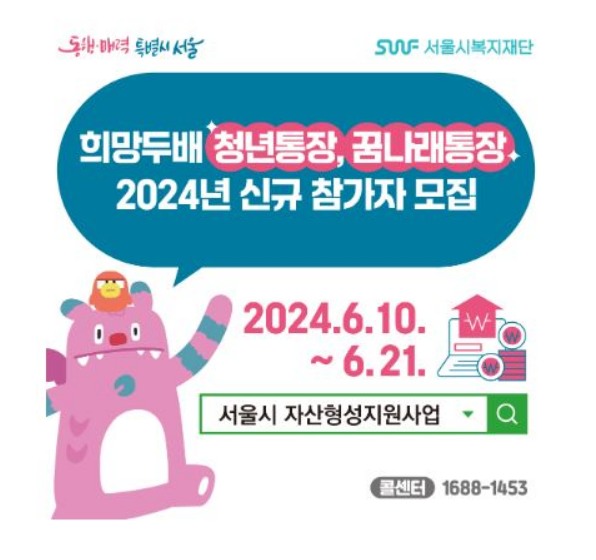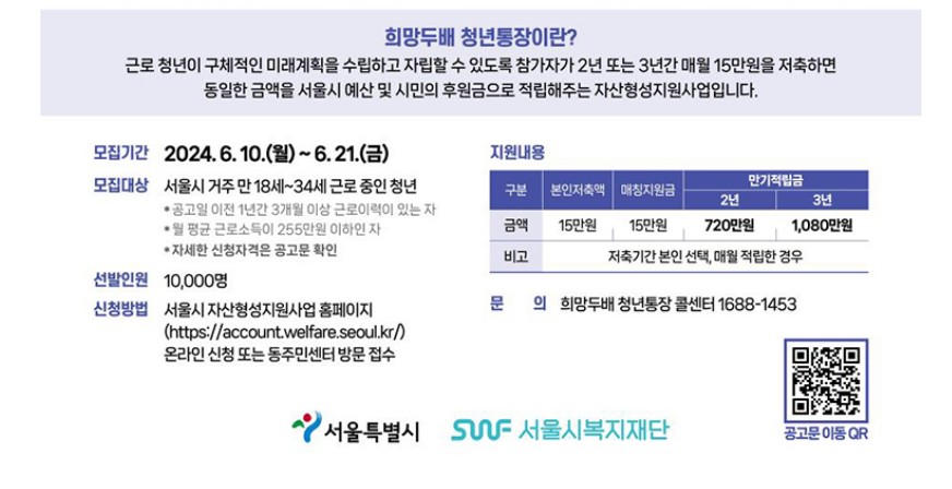 매달 15만원씩 2년 또는 3년간 꾸준히 저축을 하면 서울시와 민간 재원에서 적립 지원을 하여 납입한 금액의 2배를 지원하고, 추가로 이자까지 지원하는 저축 통장입니다.