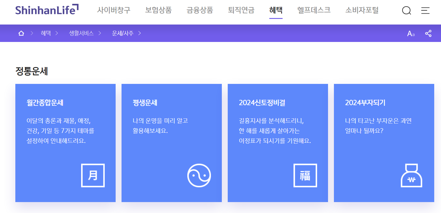 신한을 주로 사용하시는 분이라면 홈페이지나 앱을 통해 간편하게 무료 운세를 확인하실 수 있습니다. 신한 생명에서 제공하는 서비스로는 월간 종합 운세, 토정비결, 부자되기, 평생 운세 등으로 세분화되어 자세하게 운세를 보실 수 있다는 장점이 있습니다.