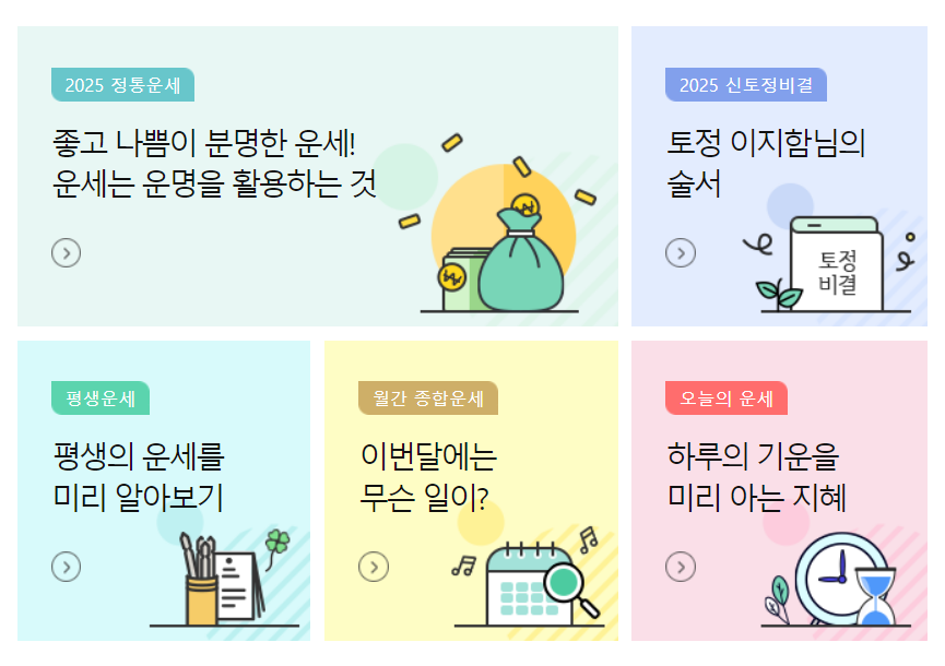 아래에 2025 무료 운세 사이트 top5 정보 보시고 간편하게 정확한 운세를 보시는데 도움되시기 바라겠습니다.