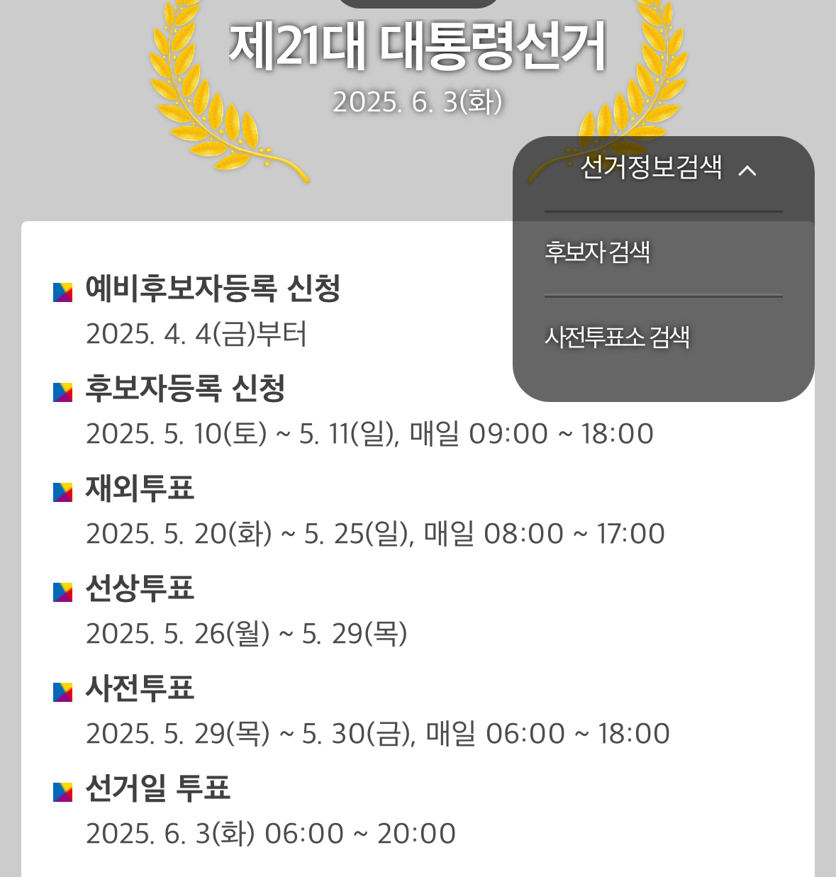 | 재외투표 | 5월 20일 화~5월 25일 일 (매일 오전 8시~ 오후 5시까지) |