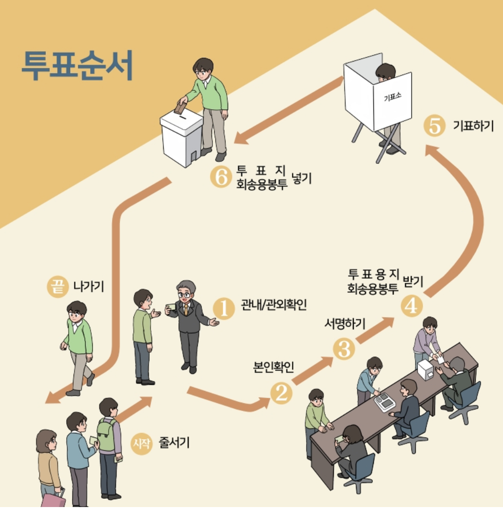 - 관내 선거인 (주소시와 투표소 관할이 같은 경우): 신분증 확인 > 투표용지 수령 > 기표소에서 기표> 투표함에 투입 후 퇴장