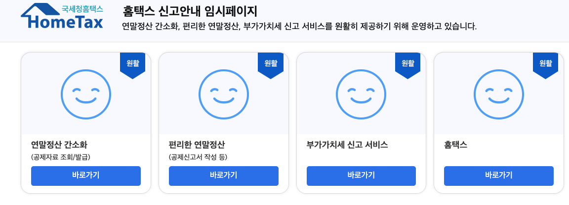 - 위 버튼을 통해 국세청 홈택스 홈페이지 접속: 로그인 진행 (공동인증서 또는 간편 로그인도 가능)