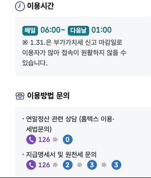 연말정산 관련해서 궁금하신 사항이 있는 경우에는 126으로 전화하시어 0번을 누르시면 바로 상담이 가능합니다.