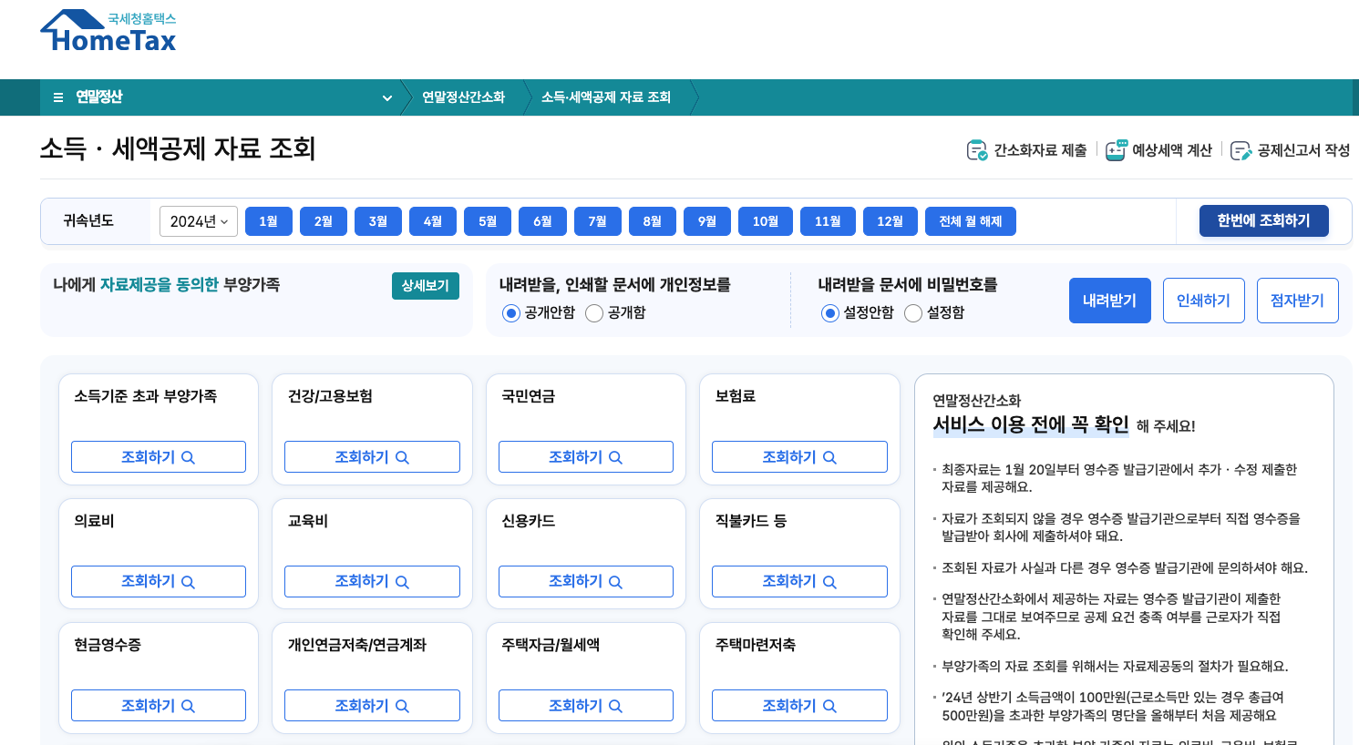 - 아래와 같은 화면이 나오면 상단 오른쪽의 '한번에 조회하기'를 클릭 : 클릭 이후 내용 확인이 필요한 경우 '오른쪽 내려받기'를 통해서 세액 공제 자료를 PDF 형태로 다운로드할 수 있으며 해당 파일을 회사 시스템에 업로드 또는 제출을 진행 홈택스