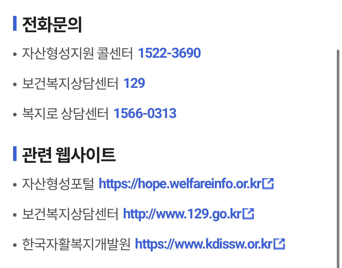 A3. 자산형성 지원 콜센터 1522-3690, 보건복지상담센터 129, 복지로 상담센터 1566-0313으로 연락하시면 됩니다.