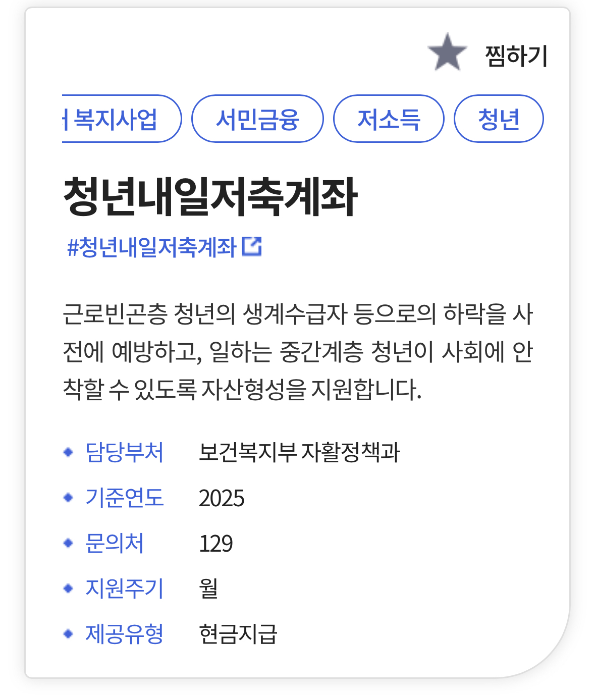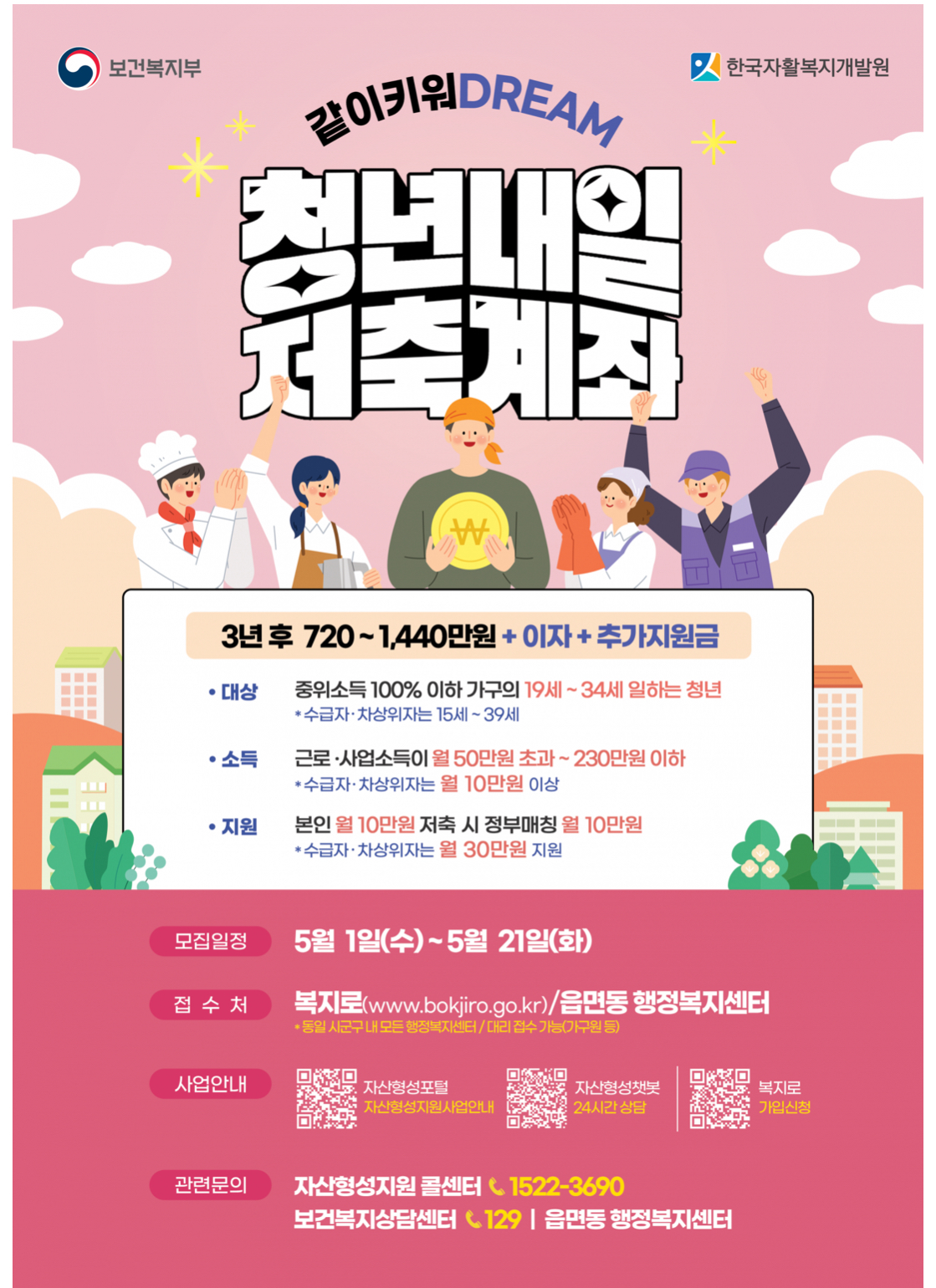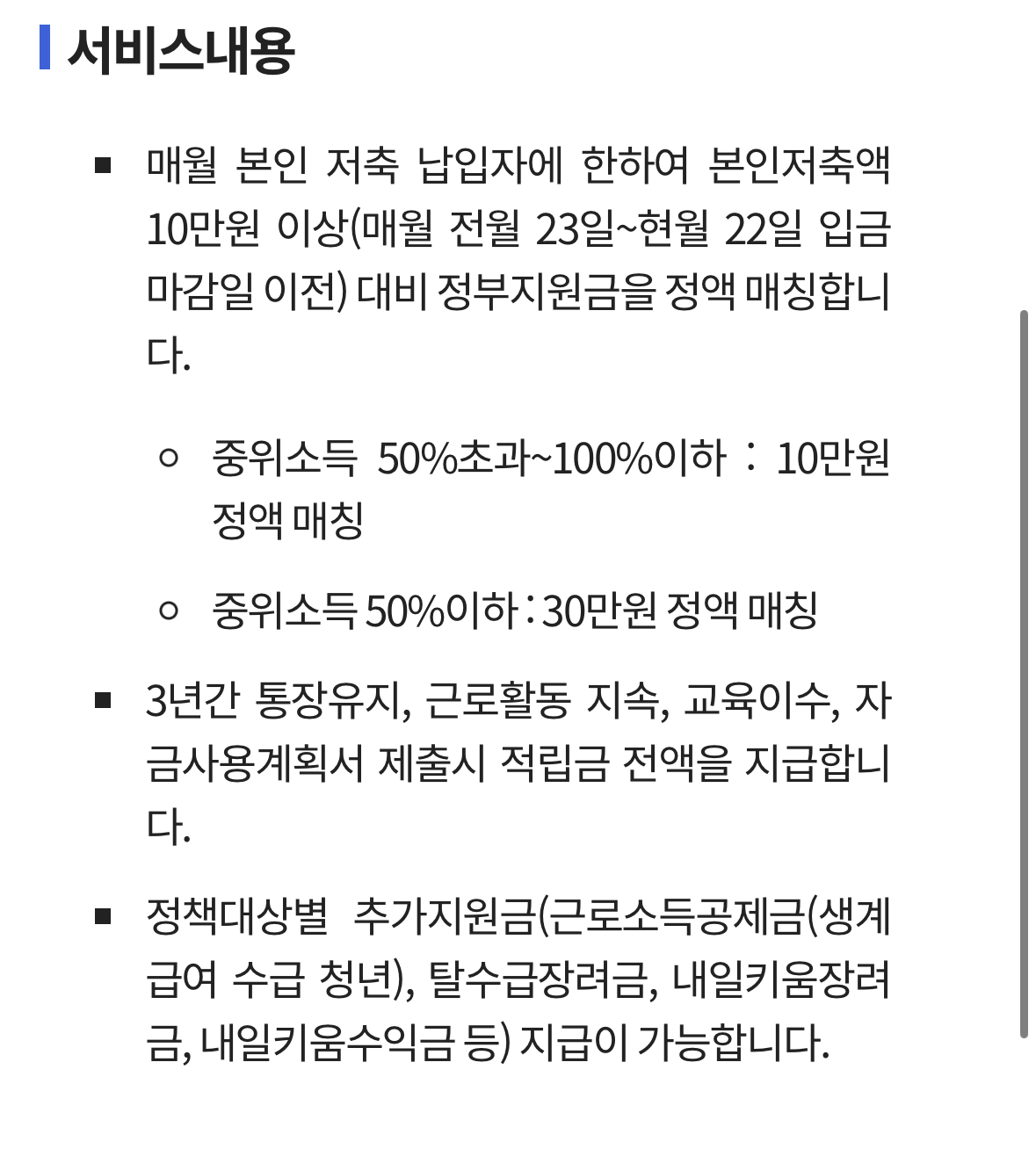 - 월 10만 원 저축 시 정부는 추가 매월 30만 원 추가 적립 지원